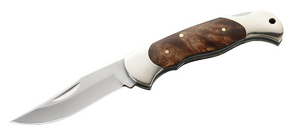 Bei diesem eleganten Taschenmesser kommen die attraktiven Wurzelholz-Schalen zwischen den Neusilberbacken gut zur Geltung. Eine klassische Rückenverriegelung sorgt für die sichere Arretierung der Klinge aus rostfreiem AISI 420-Stahl.