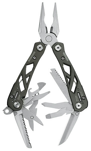 Die Zange des Gerber Multi-Tools SUSPENSION lässt sich kinderleicht aufklappen und anschließend komfortabel handhaben. Dazu trägt maßgeblich die integrierte Federung bei. Ungemein praktisch sind auch die 9 außen liegenden Werkzeuge, darunter Schere, Säge, Klinge, Flaschenöffner und Schraubendreher. Alle Werkzeuge sind feststellbar und lassen sich nach Gebrauch durch Schieber am Griff wieder bequem entriegeln. Der skelettartige Griff spart Gewicht ein und gibt den Blick nach innen frei. Mit stabilem Nylonetui, das längs und quer am Gürtel getragen werden kann. Technische Daten Länge geschlossen 10.0 cm Klingenlänge 5.3 cm Länge geöffnet 15.5 cm Gewicht 273 g