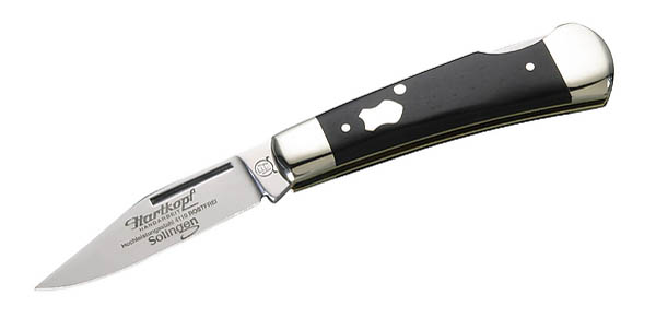 Echte Solinger Qualität! Das kompakte Taschenmesser aus dem Hause Hartkopf ist mit einer rostfreien Klinge aus dem hochwertigen Stahl 1.4110 ausgestattet, der eine Rockwellhärte von 56 HRC aufweist. Auf den Messingplatinen des Heftes sitzen Beschläge aus poliertem Neusilber und edle Schalen aus Ebenholz, die mit einem Gravurplättchen versehen sind. Die Klinge wird in geöffnetem Zustand über eine Rückenverriegelung festgestellt.