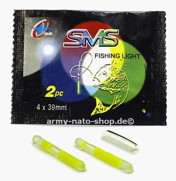 Mini-Leuchtstäbe (Knicklichter) grün neu (4 x 39 mm / 2er-Pack ) Mini-Leuchtstäbe (Knicklichter für Fischer usw.) im 2er-Pack. Farbe: grün Maße: 4 x 39 mm Material: Leuchtstab: Kunststoff Füllung: chemische Leuchtfarbe