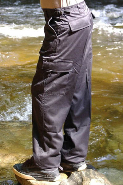 Hose mit 2 seitlichen Schubtaschen, 2 Pattentaschen an den Oberschenkelseiten und 2 Gesäß-Pattentaschen, verstellbarem Bundband, Hosen- öffnung mit Reißverschluss, Beinabschluss durch Bänder verstellbar. Farbe: schwarz Größen: S - XXL Material: 65% Polyester/35% Baumwolle