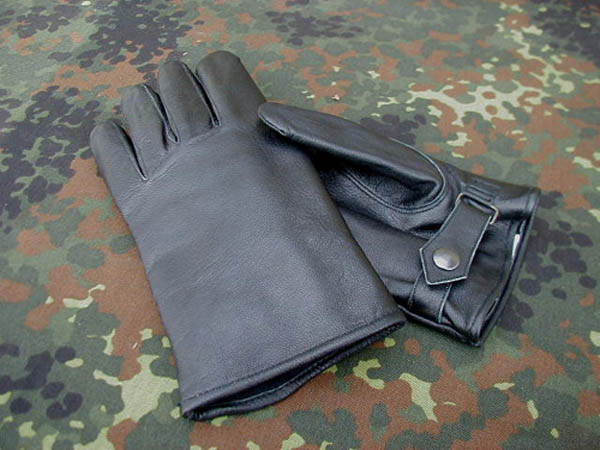 Fingerhandschuhe aus Leder der Bundeswehr, weiche Innenfütterung, Weitenverstellband mit Druckknopf am Handgelenk.