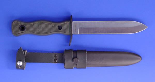 Kampfmesser nach TL der Bundeswehr, zerlegbar, Klinge aus rostfreiem Stahl, Griff aus Kunststoff, Metallscheide mit G?rtelschlaufe und Griffhalteband aus Leder.
