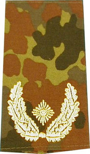 Rangschlaufen (Heer) Bw flecktarn/gold ´Brigade-General´ Aufschiebeschlaufen der Bundeswehr (Heer) für die Feldbekleidung in flecktarn, gewebt, leicht trapez-förmig, gold bestickt, paarweise für Dienstgrad: "Brigade-General" Farbe: 5-Farben flecktarn Bestickung: gold Länge: 90 mm Breite: 52/60 mm Material: 100% Baumwolle